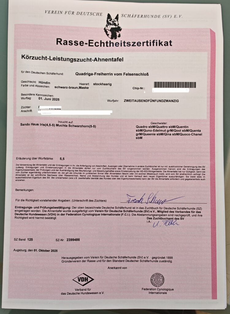 Hoy me ha llegado de Alemania el pedigrí de Quadri