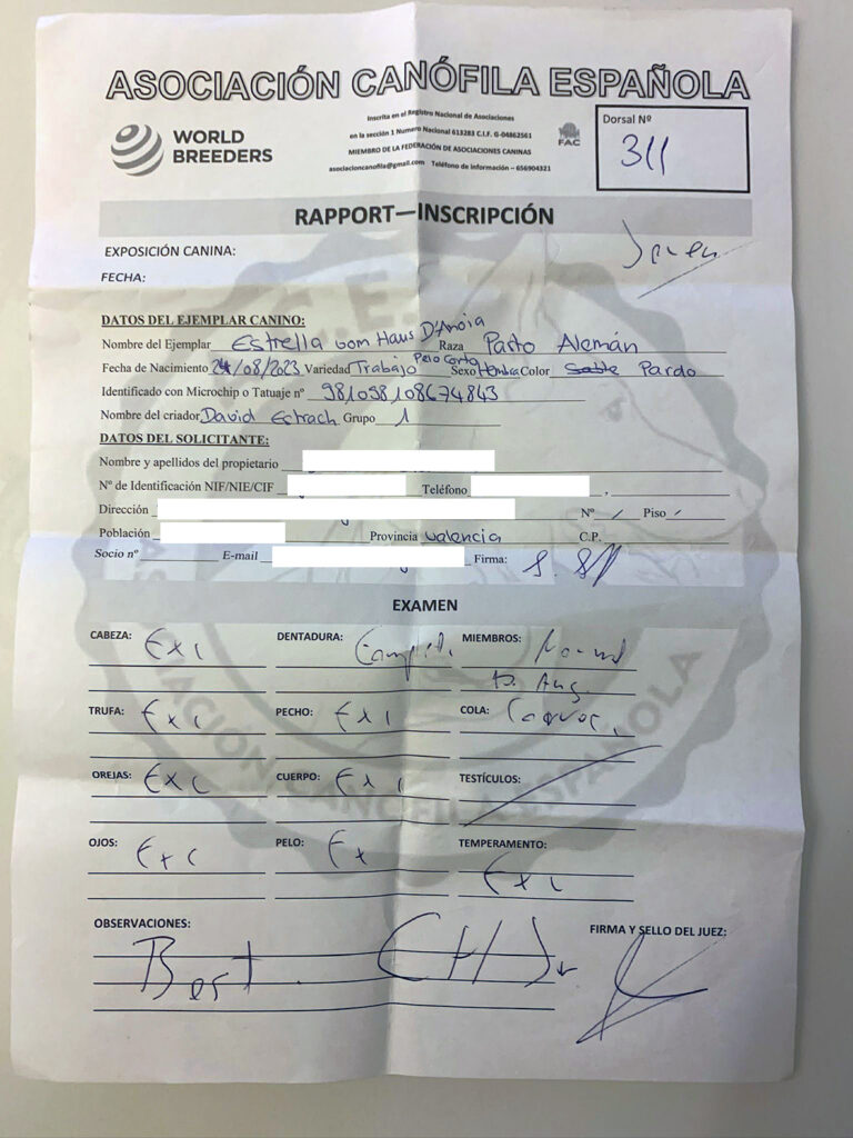 Estrella Vom Haus d’Anoia es fruto de nuestra anterior «Camada E 2023« , y junto a su guía Evelyn Steinhart a participado en el Campeonato de España de la Asociación Canófila Española de Belleza Canina que tuvo lugar el pasado fin de semana en Bellreguard, Valencia.